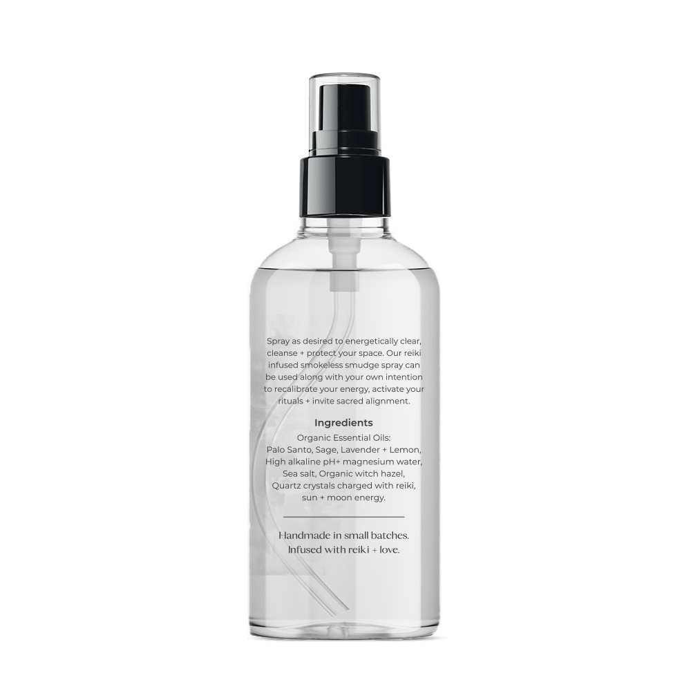 - Spray as desired to energetically clear, cleanse and protect your space. Our reiki infused smokeless smudge spray can be used along with your own intention to cleanse and clear yourself/your environment, recalibrate your energy, activate your rituals + invite sacred alignment.