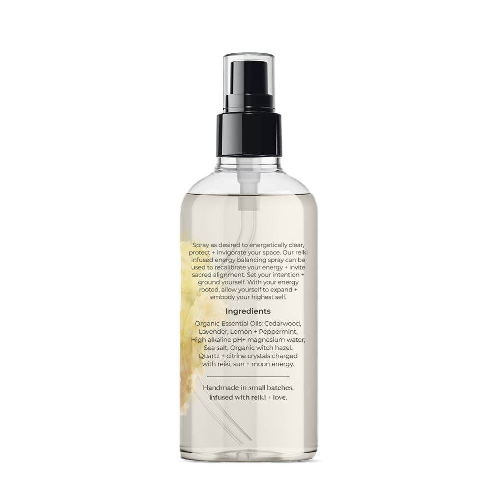 - Spray as desired to energetically clear, ground and invigorate yourself/your environment. Our reiki infused energy balancing spray can be used to recalibrate your energy and invite sacred alignment. Set your intention + ground yourself. With your energy rooted, allow yourself to expand and embody your highest self.