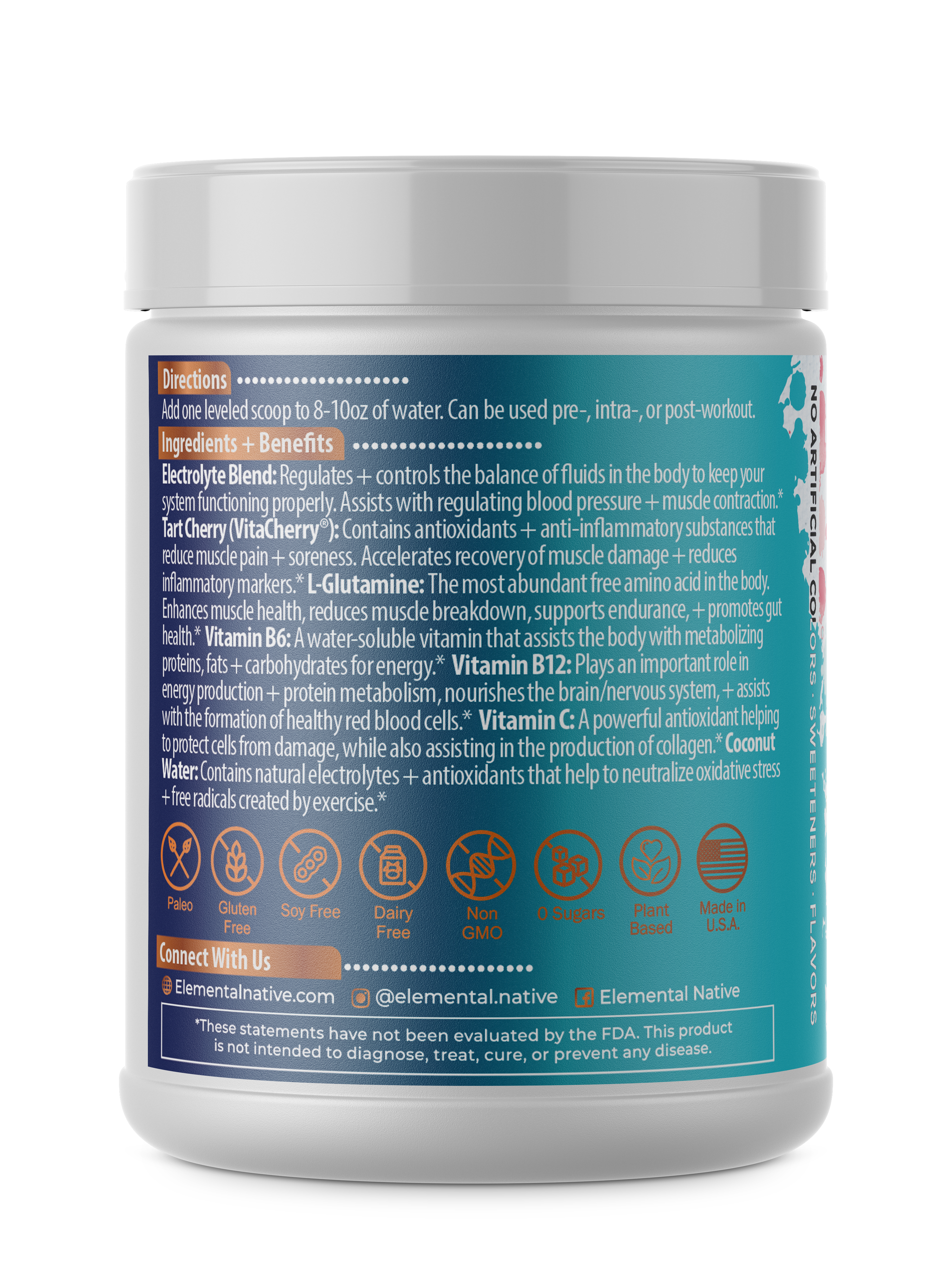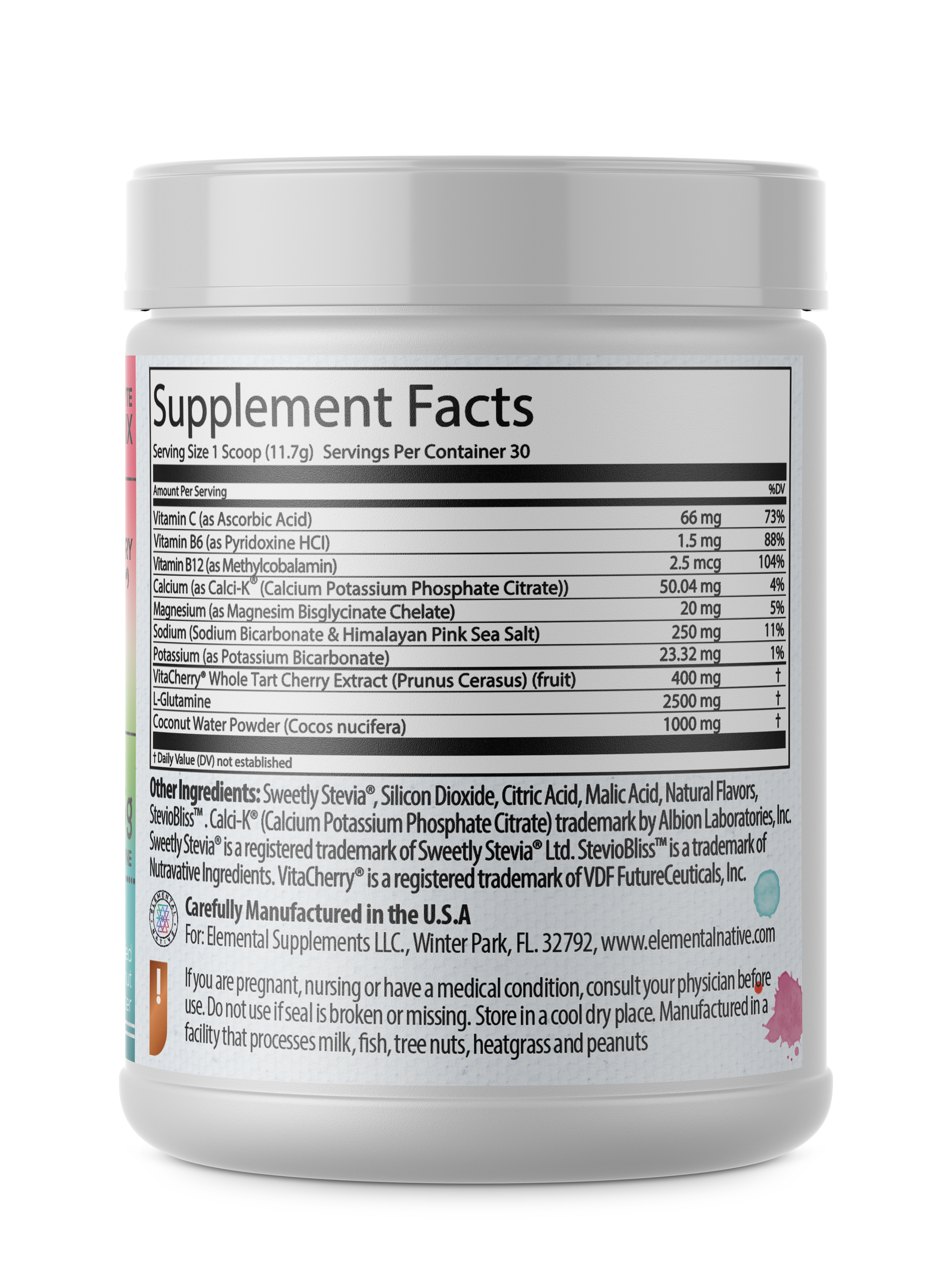 - Vitamin C, Vitamin B6, Vitamin B12, Magnesium, Tart Cherry Extract (VitaCherry®), L-Glutamine, Calcium (Calci-K®), Potassium, Himalayan Pink Sea Salt, Coconut Water Powder, Sweetly Stevia®, Silicon Dioxide, Citric Acid, Malic Acid, Natural Flavors